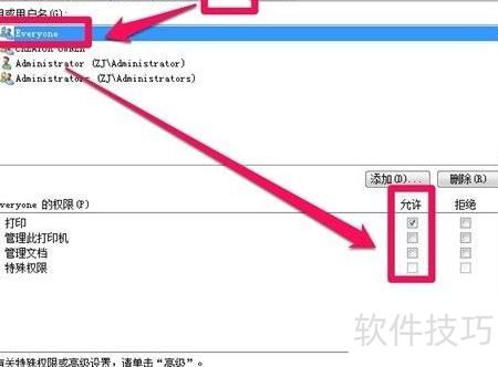 4、 在打印机设置窗口中,进入安全选项卡,默认情况下,everyone用户拥有打印权限,而系统管理员则具备打印、管理打印机及文档的权限。