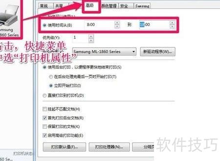 2、 右键点击目标打印机,选择打印机属性。进入高级选项卡,将使用时间设定为8:00至18:00,完成后点击确定,设置即刻生效。