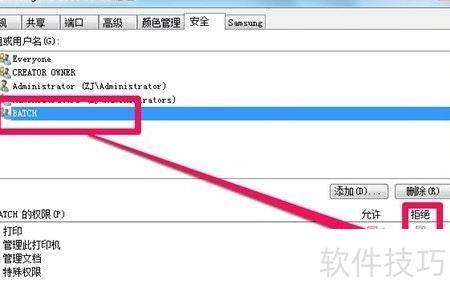 8、 选中BATCH账户,勾选权限中的拒绝打印,点击确定,完成设置。