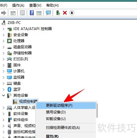 3、 在窗口右侧定位目标硬件,右键点击并选择更新驱动程序进行安装。