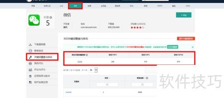 3、 在左侧菜单中选择关键词覆盖与排名,即可查看微信在360中的关键词覆盖情况,支持按指数和排名筛选。