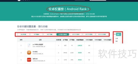 6、 进入导航栏的榜单趋势,选择安卓权重榜,点击关键词覆盖数量并切换至360市场,即可查看在该市场中关键词覆盖表现最佳的应用。