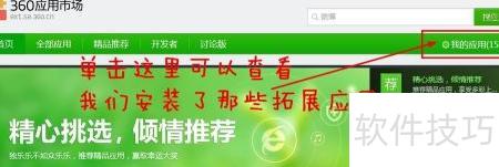 2、 双击该按钮即可进入360安全浏览器的应用市场,也就是拓展插件中心。在菜单栏右侧点击我的应用按钮,可查看已安装的所有应用或插件列表。
