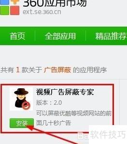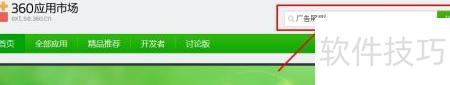 5、 在360应用市场右侧搜索框中输入所需插件名称,如广告屏蔽,找到后点击安装即可完成添加。