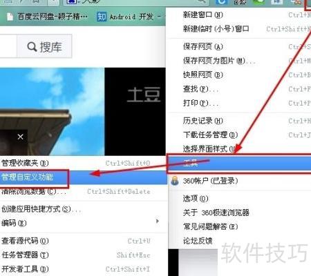 6、 打开360极速浏览器,进入设置中的工具选项,点击管理自定义功能即可查看已安装的扩展插件。
