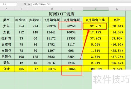 5、 计算销售占比应为女包销售额除以总销售额再乘以100%,即(20259 ÷ 61846)× 100%。