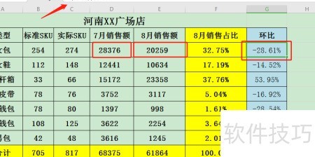 9、 例如:比较该店7月与8月女包销量的环比变化