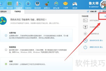 5、 点击温度监控旁的节能降温选项,进入后可设置电脑在温度过高时的自动降温方式。具体方案可根据个人需求选择,通常建议选用智能降温模式,系统将根据实际情况自动调节,有效保障设备稳定运行并延长使用寿命。