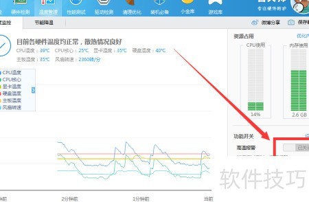 4、 在温度监控界面,点击右下角的高温报警按钮,即可启用高温警示功能。开启后,一旦电脑温度达到设定阈值,系统将自动发出警报,提醒用户设备温度过高,及时采取降温措施,保障硬件安全稳定运行。