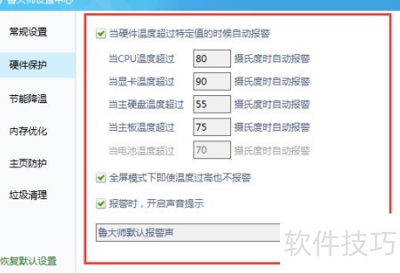 8、 在硬件保护页面中,可自定义设置各硬件温度达到阈值时的报警提示。通常默认设置已满足需求,若对散热管理有更高要求,用户可根据实际情况自行调整参数。