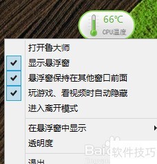 6、 将鼠标悬停在悬浮球上可查看详细温度,右键点击可进行设置,如调整透明度、设定游戏或观影时自动隐藏等功能。