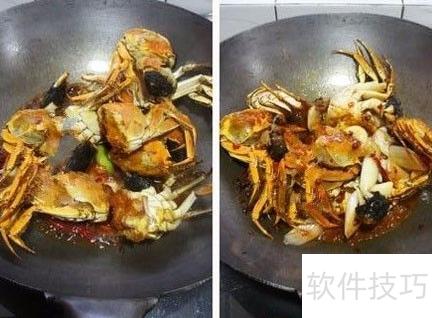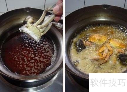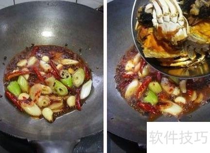 12、 将调料放入锅中,倒入炸好的河蟹翻炒均匀,裹上汤汁后即可出锅,汤汁不足时可加少量清水。