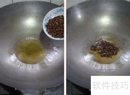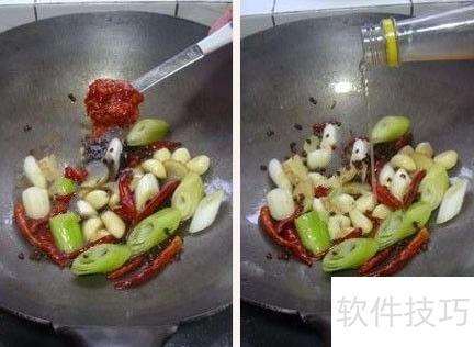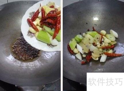 8、 冷锅冷油下花椒,小火煸香两分钟,加入葱姜蒜和红椒,继续小火炒三分钟至香味溢出。