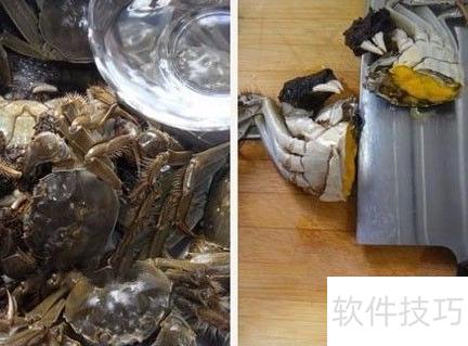 4、 待河蟹不再夹人后,用刷子清洗干净,从中间切开并立即在切口处裹上干淀粉,备用。