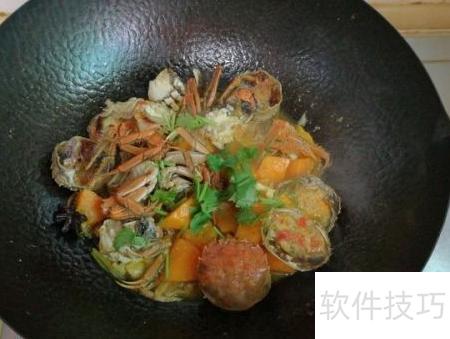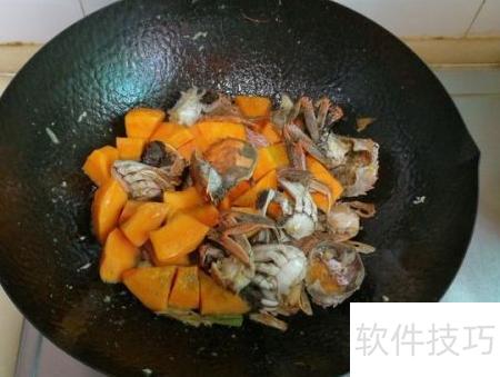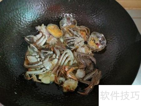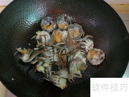 6、 滑炒河蟹至蟹黄凝固溢香。