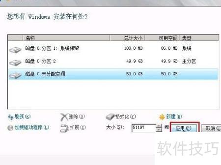 5、 返回上层,选择未分配空间,新建并应用,操作见图5所示。