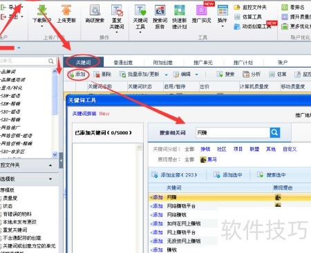 2、 进入后台,选择搜索推广,添加关键词并输入核心词进行搜索。