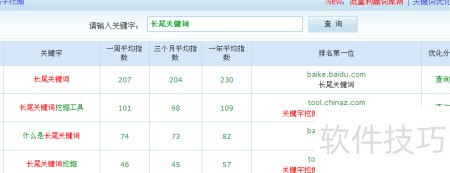4、 通过站长工具的关键词挖掘功能,输入目标词后查询,即可获取相关长尾词及其搜索指数。