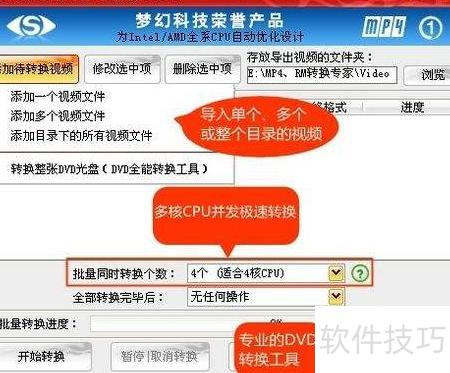 1、 MP4/RM转换专家具备强大的视频格式兼容能力,可轻松导入TS、MKV、FLV、RMVB、M2TS、WMV等多种主流视频文件。用户只需将视频文件直接拖拽至界面,或点击右上角添加待转换视频按钮即可完成导入,操作简便,充分体现了软件在交互设计上的贴心与人性化。若拥有DVD光盘影片,还可搭配专用的DVD Ripper工具,快速提取光盘中的视频内容,并完整保留字幕、音轨及多角度信息,高效转换为适用于各类移动设备的MP4格式。尤为突出的是,该软件率先采用多核CPU并发处理技术,大幅提升转换效率,在权威科技媒体太平洋网的专业测评中,其最新版本荣登转换速度榜首,展现出卓越的性能表现,是日常视频转换与便携设备适配的理想选择。