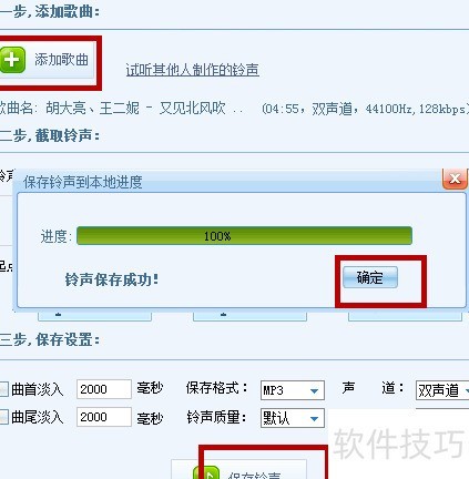 8、 铃声截取完成后,点击确定并选择保存,系统会提示保存位置。若未找到文件,可点击添加歌曲查看已截取的音频,随后将其移动至桌面即可。