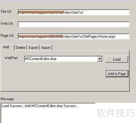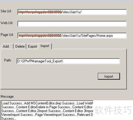 2、 启动SharePoint WebPart管理工具,输入站点地址、Web路径及页面链接后点击加载按钮,即可获取该页面全部Web部件信息,具体操作界面所示。