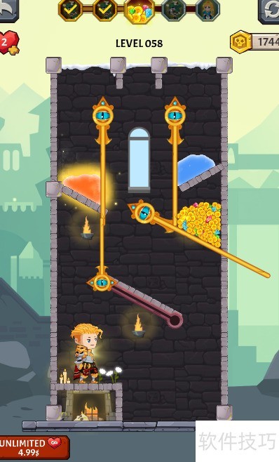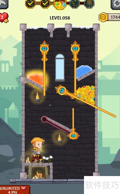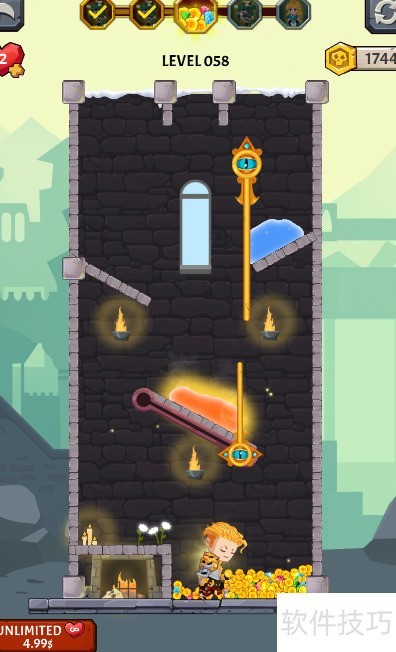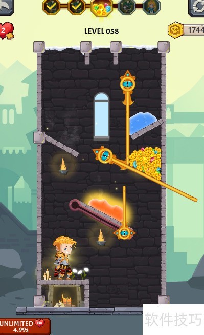 1、 金发王子位于下方平台,宝藏上方有水,左上方为熔岩,取得宝藏即可过关,具体情形见图示。
