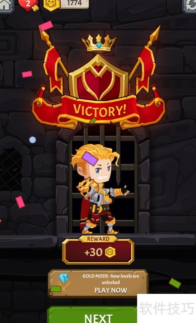 5、 金发王子夺得宝藏,画面弹出通关提示,顺利过关。