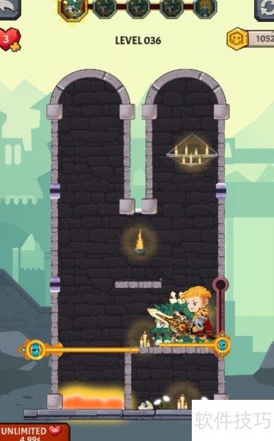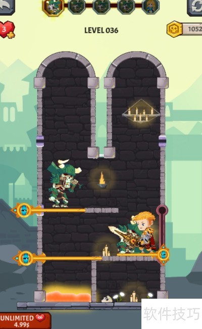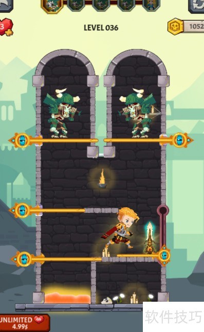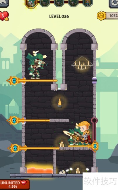 1、 任务要求清除上方的骷髅士兵,金发少年位于熔岩一侧,场景内设有四个别针和一个推拉杆,具体布局见图示。