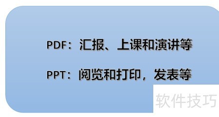 6、 PPT主要用于汇报、教学和演讲等展示场景,而PDF则适用于阅读、打印及发布,适合无需修改的文档共享。
