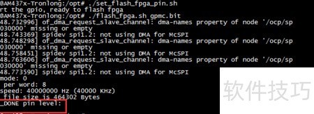 3、 运行指定命令以启动FPGA程序加载功能,通过ARM处理器经SPI总线将gpmc.bit文件写入FPGA。执行脚本flash_fpga.sh后,系统会输出运行状态信息。若打印结果显示FPGA_DONE的值为1,则表明.bit文件已成功加载至FPGA并准备就绪,可进行后续操作。