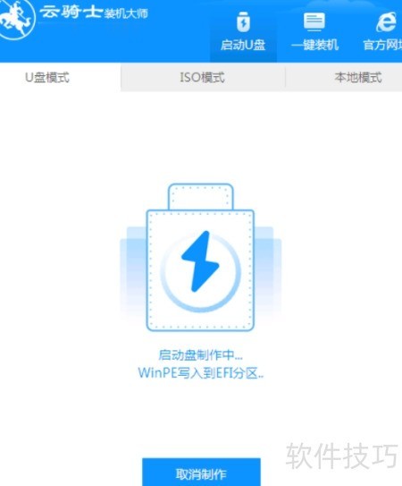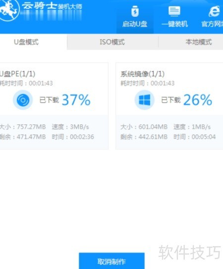 4、 云骑士将开始下载系统,如需更换可点击取消制作并重新选择。由于系统文件较大,下载过程需要一定时间,请用户保持耐心等待完成。