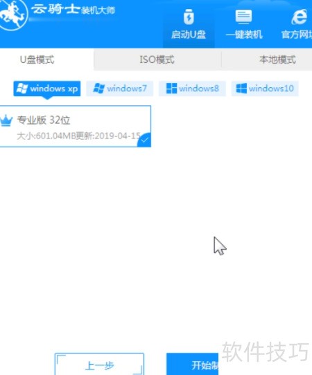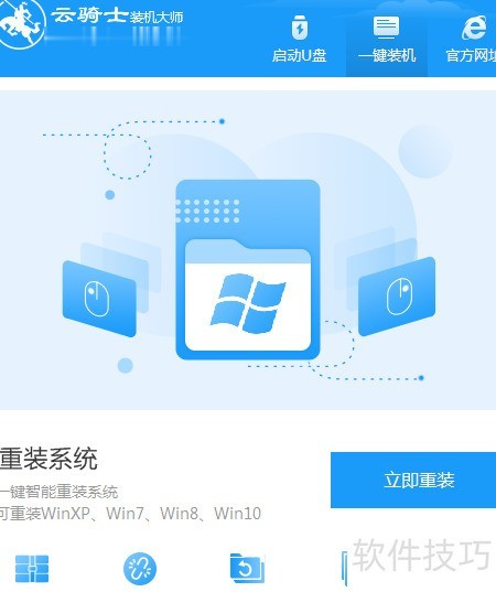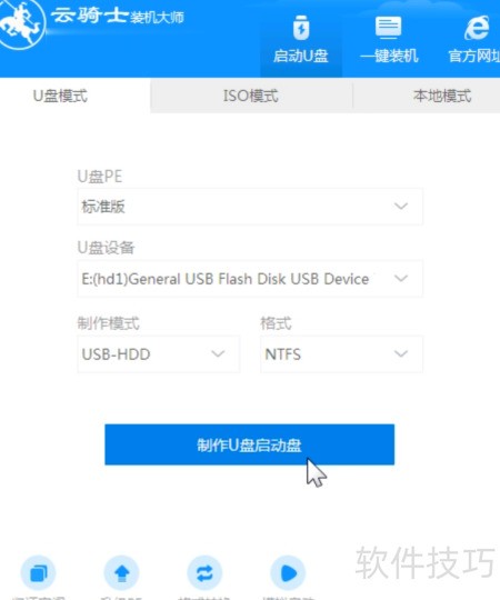 1、 首先从云骑士官网下载其一键重装系统软件,安装并运行云骑士装机大师。程序会自动识别电脑配置并进入启动U盘制作界面,此时需将U盘插入电脑以供后续操作使用。