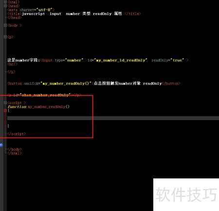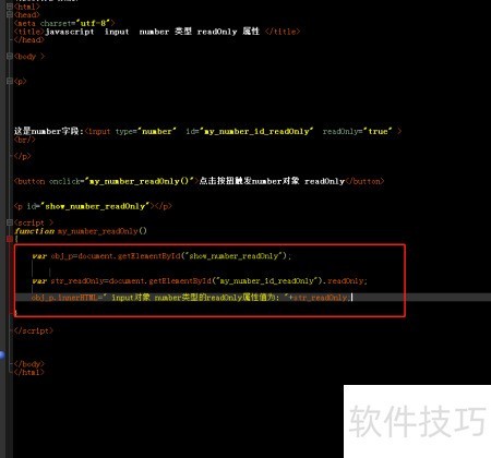 6、 在自定义函数中获取输入的数字对象,通过只读属性判断其状态,并将结果写入段落标签内进行展示。