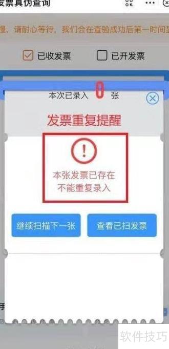 8、 多张发票同时扫描时若重复,系统将自动提示。