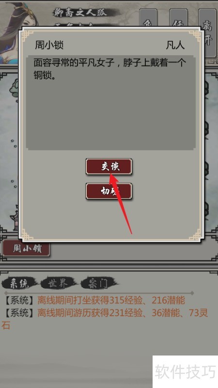 3、 第三步:在弹出窗口中点击,即可与周小锁对话。