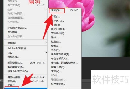 1、 打开编辑菜单,进入首选项中的常规设置选项。