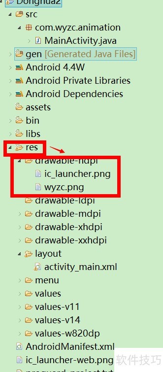 2、 将需添加透明度渐变效果的图片放入res目录下的drawable文件夹中,图片名称须改为英文,例如wyzc.png。