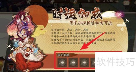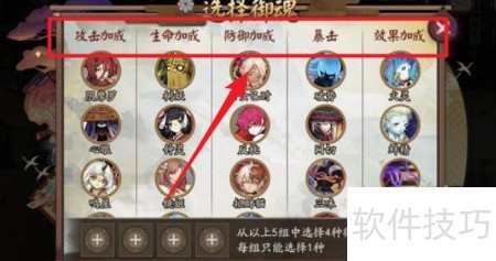 3、 活动中,玩家需从五种加成御魂中选出四个进行强化,必须选满四个,不可只选一个、两个或三个。