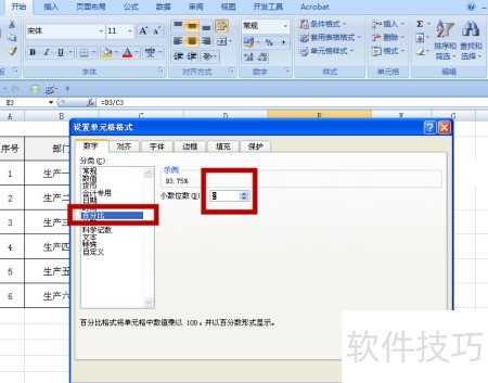 6、 在设置单元格格式的数字选项中选择百分比,并设定所需的小数位数。