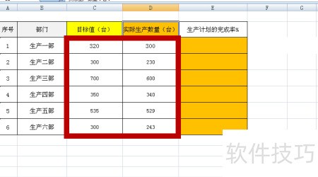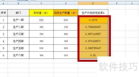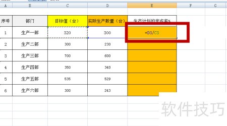 2、 在E3单元格中输入公式=D3/C3,用实际生产数量除以目标值。