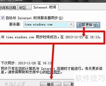 6、 进入Internet同步设置,勾选自动与网络时间服务器同步,点击立即更新后确认即可完成。