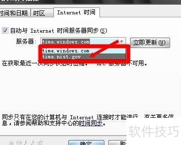 8、 若开启时间服务后仍无法同步,可尝试更换时间服务器(点击▼选择其他选项)。
