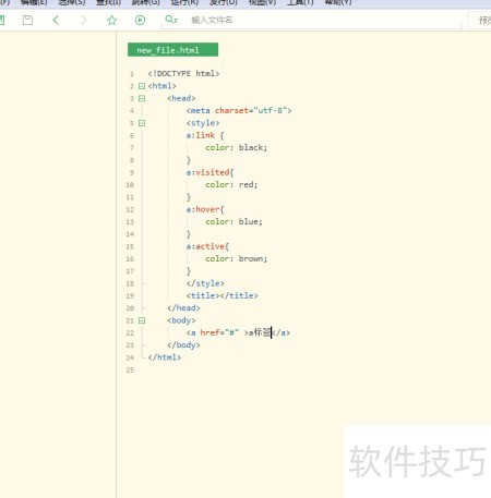 1、 启动HBuilder,创建HTML文件,编写a标签的伪类样式。
