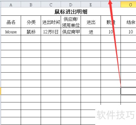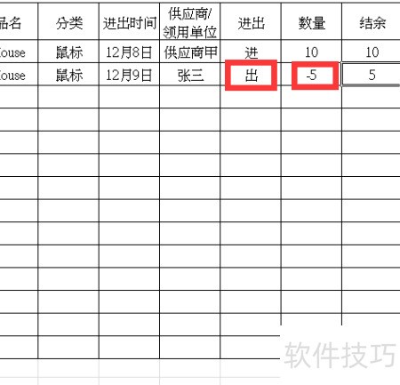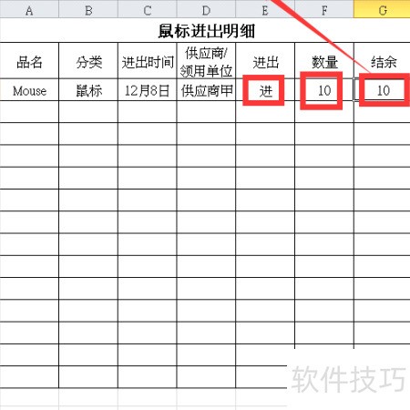 4、 录入首笔数据,将结余栏数值设为与数量栏相同,并在指定位置输入:=F3。
