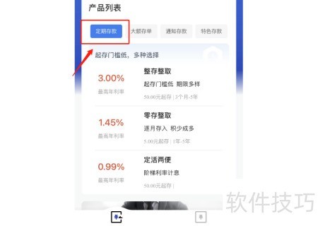1、 登录建行APP,选择存款产品,进入定期存款功能页面。