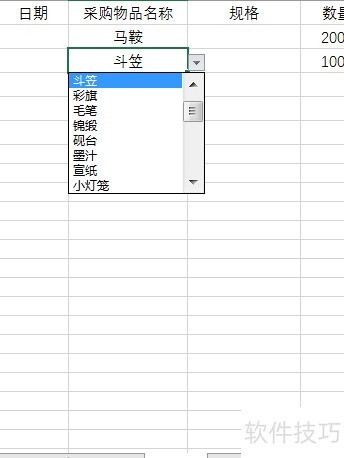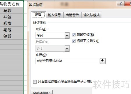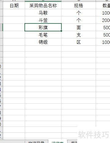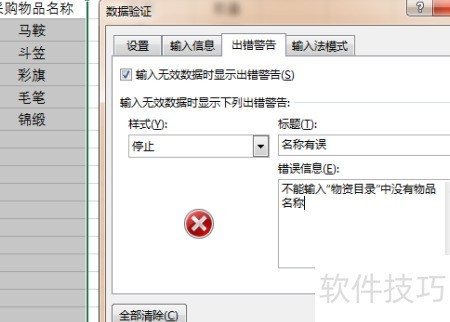 2、 第二步是规范物品名称的输入方式。针对进货表和发货表中的物品名称列,需设置数据验证功能,实现下拉选择,避免手动输入错误。首先选中进货表中采购物品名称所在列,进入数据选项卡,在数据工具区域点击数据验证。在弹出的对话框中,在验证条件下的允许选项选择序列,然后在来源栏中引用物资目录工作表的A列数据区域。接着切换到出错警告选项卡,设定提示内容,确保输入非列表内名称时自动弹出警示。完成设置后,该列将仅支持从下拉菜单中选择已有物品名称,有效保证名称统一性。同样操作也应用于发货表的对应列,确保两表与物资目录保持一致,提升数据准确性和录入效率。