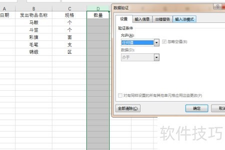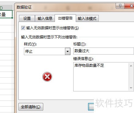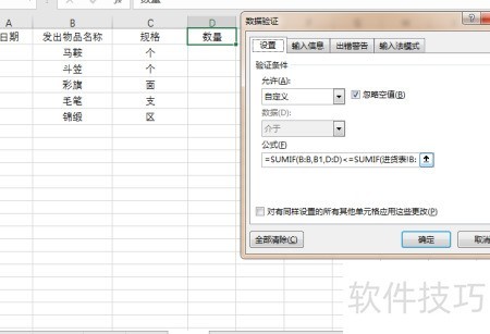 4、 第四步,设定发货表中数量的输入限制。首先打开发货表,清除数量列(即D列)中之前随意填写的数据。接着选中整个D列,进入数据选项卡,在数据工具功能区点击数据验证按钮。在弹出的数据验证对话框中,将允许条件设置为自定义,然后在公式栏输入:=SUMIF(B:B,B1,D:D)<=SUMIF(进货表!B:B,B1,进货表!D:D)。该公式的作用是:当在发货表中输入某商品的数量时,系统会自动统计该商品在发货表中的累计发货总量,并与进货表中该商品的总进货量进行比对,只有当发货总量不超过进货总量时,才允许输入。由于公式中采用了整列引用的方式,因此需确保从第1行开始计算,以保证逻辑正确。随后切换至出错警告选项卡,设置提示语,如发货数量不能超过进货总量,请核对后重新输入。完成设置后,点击确定,即可实现对发货数量的有效控制,防止超发情况发生。