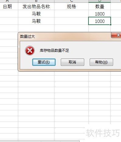 5、 第五步为验证测试。清除进货表中的数量数据,重新录入新数据进行检验,例如录入马鞍2000个、斗笠1000个,随后检查库存表,显示数量无误。接着进入发货表操作,第一笔发货录入马鞍1800个,系统正常接收;当尝试录入第二笔马鞍1000个时,系统自动拦截并弹出警告提示,将数量修改为200后,即可成功录入,验证了系统对超量发货的控制功能。