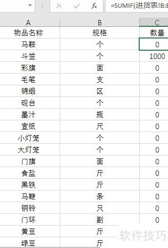 3、 第三步是创建库存表。将物资目录工作表中的物品名称和规格两列内容完整复制到库存表中对应的库存物品名称和规格列。随后,利用SUMIF()函数统计每种物资的当前库存数量。在C2单元格输入公式:=SUMIF(进货表!B:B,库存表!A2,进货表!D:D)-SUMIF(发货表!B:B,库存表!A2,发货表!D:D),该公式通过计算进货总量减去发货总量得出结存数量。将此公式向下填充至C列其他单元格,实现全部物资库存的自动统计。