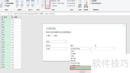 2、 选中姓名列,进入主页的分组依据,在弹出界面选择默认格式,将操作设为所有行,最后点击确定即可完成设置。